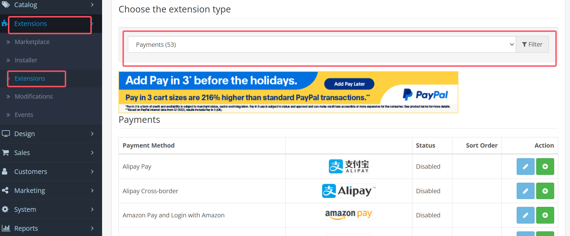 登錄 OpenCart 后臺(tái),進(jìn)入 “擴(kuò)展> 擴(kuò)展 > 支付方式”,找到 “我的支付插件”,點(diǎn)擊 “安裝”,然后點(diǎn)擊 “編輯” 配置訂單狀態(tài)等參數(shù),最后啟用插件。